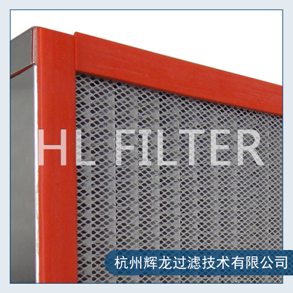 高效耐高溫過濾器使用隔板式設(shè)計(jì),波紋形隔板可以精確地保持褶層間距,在最小阻力下,最大限度地利用濾料。過濾器濾材兩面180褶翻折形成鍥形褶層,濾料折彎時(shí)有兩道壓痕,使其在隔板的尾端開成鍥形盒式褶層,鍥形盒式褶層可以防止濾料破損。
